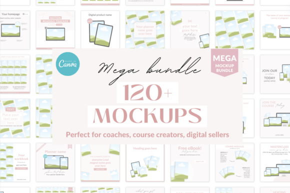 The ultimate digital tech mockup bundle. Over 120 digital mockups for digital product sellers, course creators, coaches, and more are included.
